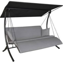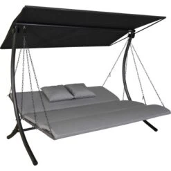 Das robuste Gestell der Hollywoodschaukel besteht aus verzinktem und pulverbeschichtetem Stahl. Das Sonnendach ist aus wetterfestem Textil Gewebe gefertigt und ebenfalls verstellbar. Durch Vor- oder Zurückschieben oder Neigen des Daches ist stets optimaler Sonnenschutz gegeben.