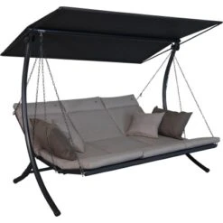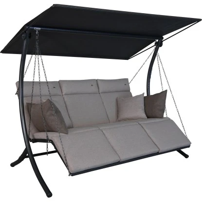 Die moderne Hollywoodschaukel Swing Smart ist ein echtes Designerstück und zählt zu den High-End Hollywoodschaukel Modellen der Firma Angerer. Die ergonomisch geformte Sitzfläche besteht aus robustem und dennoch leicht flexiblem Textilene Gewebe und bietet als 3-Sitzer viel Platz. Dank der Kettenaufhängung kann die Sitz- und Liegeposition individuell verstellt werden. Je nachdem, welche Position gewünscht ist, können die mitgelieferten Karabiner in jedes beliebige Kettenglied eingehängt werden. Neben der klassischen Sitzposition kann die Schaukelbank in eine Liegefläche oder in die U-förmigen Swing-Position umgewandelt werden. Der Clou: trotz abgeklappter Lehne lässt es sich noch bequem Schaukeln. Jede der drei Sitzauflagen hat ein extra dick gepolstertes Kopfteil, das mit einer schönen Logo-Stickung verziert ist. Alle Kissenbezüge sind aus einem besonders weichen Stoff gefertigt und lassen sich dank der praktischen Reißverschlüsse einfach abnehmen und bei 30° C in der Maschine waschen. Vier Sofakissen sind ebenfalls im Lieferumgang enthalten. Das robuste Gestell der Hollywoodschaukel besteht aus verzinktem und pulverbeschichtetem Stahl. Das Sonnendach ist, genau wie die Sitzbespannung, aus wetterfestem Textilene Gewebe gefertigt und ebenfalls verstellbar. Durch Vor- oder Zurückschieben oder Neigen des Daches ist stets optimaler Sonnenschutz gegeben.