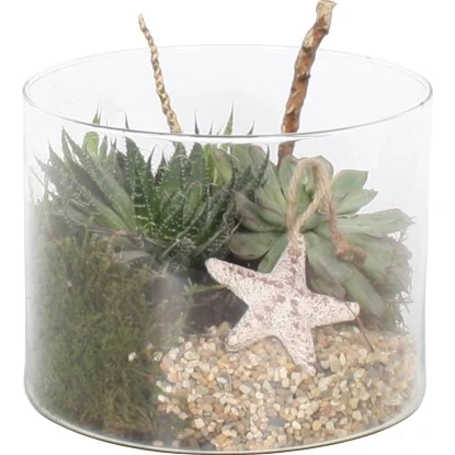 In diesem Arrangement sind eine Haworthia und eine Echeveria mit viel Liebe zum Detail und unterschiedlichen Materialien in einer Glasvase arrangiert. Sukkulente Pflanzen haben sich zu echten Trendpflanzen entwickelt. Sie sind pflegeleicht und unverwüstlich.