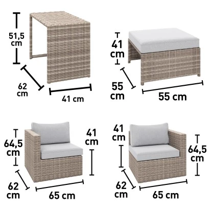 Die Loungemöbel versprühen ein gemütliches Flair auf dem Balkon und der Terrasse. Sie bieten Platz für entspannte Grillabende und nette Gespräche mit Gästen. Mit ihrem natürlichen, modernen Design in der Farbe Sand fügen sich die Balkonmöbel in jeden Außenbereich ein.