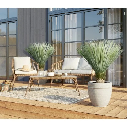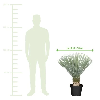 Bei der Lieferung ist die Blaublättrige Palmlilie bereits ca. 80 cm hoch und hat einen Durchmesser von etwa 70 cm. Sie durfte 15 bis 20 Jahre unter der Sonne Italiens wachsen und kommt direkt hierher zu dir nach Hause. Geliefert wird sie in einem PCR-Topf aus recyceltem Kunststoff mit reduziertem Torfanteil (60 % Torf). Der großzügig bemessene Topf hat einen Durchmesser von ca. 50 cm.