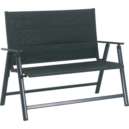 Mit der Gartenbank Pacora entsteht eine bequeme Sitzgelegenheit für den Balkon, die Terrasse oder den Garten. Sie verfügt über ein stabiles und witterungsbeständiges Aluminium-Gestell mit Armlehnen und ist mit einer schwarzen Textilbespannung ausgestattet. Bei Nichtgebrauch lässt sich das Gartenmöbel platzsparend zusammenklappen. Die Maße betragen 96 cm x 119 cm x 63 cm (H x B x T), während die Sitzhöhe von 42,5 cm misst. Es können zwei Personen gleichzeitig Platz nehmen.