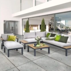 Das Gestell ist aus Aluminium gefertigt und ist somit gegenüber Gestellen aus anderen Materialien rostbeständig. Die Holzoptik-Komponenten bestehen aus WPC (=Holz-Kunststoff Gemisch) und sind dadurch wetterbeständig: die Streben verbiegen und verziehen sich nicht, eine Nachbehandlung oder ein Streichen ist nicht erforderlich. Die Sitzauflagen und Rückenkissen runden das elegante Flair ab. Die Bezüge können mithilfe von verdeckten Reißverschlüssen bei Bedarf abgenommen und gewaschen werden. Die Deko-Kissen bieten Gemütlichkeit und die Sitzauflagen haben mit ca. 10 cm einen hohen Sitzkomfort.