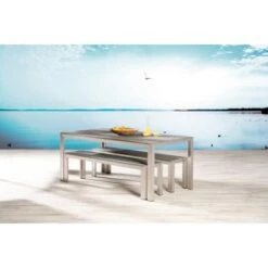 Das Gartenmöbel-Set Seattle besteht aus einem Tisch und zwei Bänken. Die schlichte Formensprache prägt das edle Design dieser Sitzgruppe. Die hochwertigen Möbel bestehen aus einem silberfarbenen, gebürsteten Aluminiumgestell im Edelstahl-Look. Tischplatte sowie Sitzfläche der Bank bestehen aus einer innovativen Lattung aus geformten Aluminiumleisten in anthrazitfarbener Holzoptik. Die Sitzgruppe ist absolut wetterfest, UV-beständig und pflegeleicht. Sie eignet sich somit ideal für den Außenbereich sowie für den Wohnbereich.