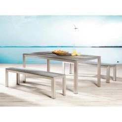 Das Gartenmöbel-Set Seattle besteht aus einem Tisch und zwei Bänken. Die schlichte Formensprache prägt das edle Design dieser Sitzgruppe. Die hochwertigen Möbel bestehen aus einem silberfarbenen, gebürsteten Aluminiumgestell im Edelstahl-Look. Tischplatte sowie Sitzfläche der Bank bestehen aus einer innovativen Lattung aus geformten Aluminiumleisten in anthrazitfarbener Holzoptik. Die Sitzgruppe ist absolut wetterfest, UV-beständig und pflegeleicht. Sie eignet sich somit ideal für den Außenbereich sowie für den Wohnbereich.