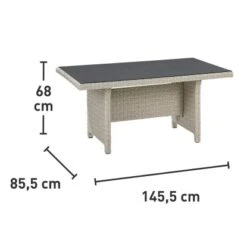Der Gartentisch aus der Serie Vermont in klassischem Design eignet sich ideal zum gemütlichen Zusammensitzen in Ihrem Garten. Er lässt sich ideal mit anderen Möbelstücken aus der gleichen Serie kombinieren. Das Gestell besteht aus leichtem Aluminium, das mit handgeflochtenem Polyrattan in der Farbe Cloud ummantelt ist. Durch die Herstellungsweise ist jedes Exemplar ein Unikat. Das Material ist wetterbeständig und pflegeleicht. Die Tischplatte, die ebenfalls aus Polyrattan besteht, ist mit einer grauen Glasplatte bestückt. Diese sorgt dafür, dass Sie den Tisch besonders leicht reinigen können. Mit den Maßen 145,5 cm x 85,5 (B x T) bietet der Tisch Platz für sechs Personen. Aufgrund des Gewichtes von 20 kg lässt er sich leicht transportieren.
