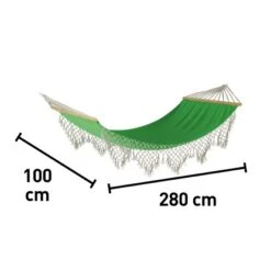 Ein ebenso gemütliches wie dekoratives Plätzchen für den Außenbereich stellt die grüne Hängematte Salcha dar. Mit Ihr können Sie eine komfortable Liegefläche in Ihrem Garten, auf der Terrasse oder auf dem Balkon realisieren. Darüber hinaus ist die Hängematte ebenso für den Innenbereich geeignet. Sie ist im neutralen Grün gehalten, das mit vielen Innen- und Außengestaltungen harmoniert. Als Blickfang fungieren dabei die dekorativ herabhängenden Seitenvolants in gehäkeltem Gittermuster.