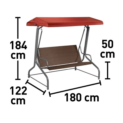 Die Neigung des Sonnendaches lässt sich individuell einstellen, sodass es an den Sonnenstand angepasst werden kann. Die rote Bespannung besteht aus 100 % Polyester (180 g/m²). Bei einer max. Belastbarkeit von 110 kg können drei Personen Platz nehmen.