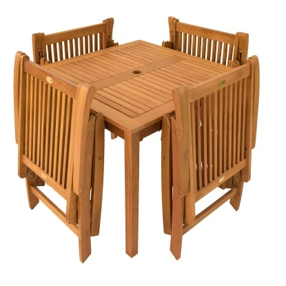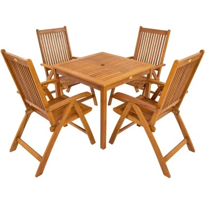 Dieses Gartenmöbelset Bangor von indoba® bietet Platz für vier Personen. Dieses Gartenmöbel erfreut Sie durch sein witterungsbeständiges Holz mit einer langen Lebensdauer. Das Set besteht aus vier Hochlehner Stühlen und einem Quadratischen Gartentisch. Eine Öffnung für den Sonnenschirm befindet sich in der Mitte der Tischplatte. Die Rückenlehne der Hochlehner ist fünffach verstellbar. Die Gartenstühle lassen sich für eine einfache und platzsparende Lagerung einfach zusammenklappen. Alle Komponenten dieser Gartengarnitur sind mit Teaköl vorbehandelt.