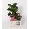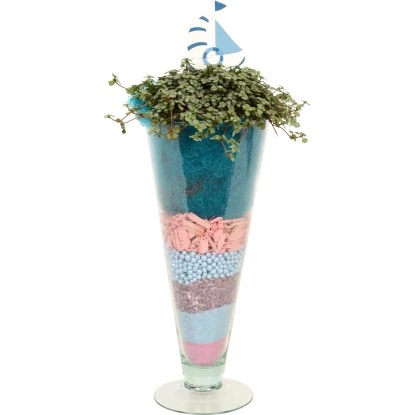 Dieses farbenfrohe Arrangement besticht durch die außergewöhnliche Form des Glases und die unterschiedlichen Schichten von Deko-Materialien. Bepflanzt ist es mit einer Kanonierblume (Pilea), der schöne Boot-Einstecker rundet das Arrangement ab.