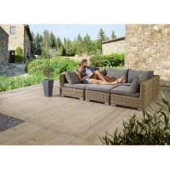 Die 3er Couch in der Farbe Nature besticht dabei als größtes Einzelelement der Stratford-Gruppe. Trotzdem verfügt die Garten-Couch über das bewährte Klicksystem und lässt sich so mühelos erweitern und nach Ihren Wünschen anpassen. Im Lieferumfang inbegriffen sind bequeme Polsterauflagen aus wetterbeständigem Polyester mit 8 cm dickem PU Schaum. Das Gestell wie auch die Auflagen sind einfach in der Instandhaltung und waschbar. Die 3er Couch der Stratford Serie ist ebenfalls in modernem Braun (Nature Dark) erhältlich.