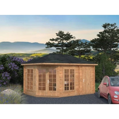 Palmako Holz-Pavillon Melanie 11,0 m² aus braun tauchgrundierten 28 mm Blockbohlen mit winddichter Chaletschnitt-Eckverbindung mit Eckeinstieg. Der Pavillon verfügt über einen Abstellraum mit Vollholztür. Die stabile, teilverglaste Doppeltür mit Leimholzrahmen und Zylinderschloss hat niedrige, mit Edelstahl abgedeckte Türschwelle. Die Doppeltür und tiefe, nach Außen öffnende Doppelfenster haben 4 mm Einfachverglasung und aufgesetzte Sprossen. Zum Bausatz gehören auch imprägnierte Fundamenthölzer, 16 mm Dachbretter und 19 mm Fußbodenbretter mit Nut und Feder, Sturmleisten, sowie Montageset. Der Pavillon ist bereits mit einer Tauchgrundierung versehen und kann nach dem Aufbau mit allen handelsüblichen Farben weiterbehandelt werden. Dacheindeckung ist nicht im Lieferumfang enthalten. Der Pavillon kann auch spiegelverkehrt aufgebaut werden.
