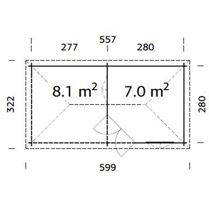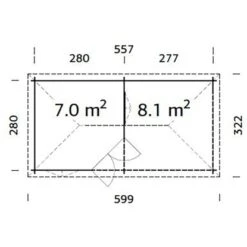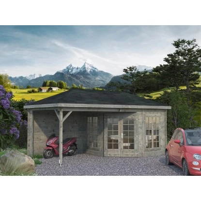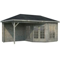 Palmako Holz-Pavillon Melanie 7,0 + 8,1 m² aus 28 mm Blockbohlen mit winddichter Chaletschnitt-Eckverbindung mit Eckeinstieg. Der Pavillon verfügt über eine praktische Überdachung mit Rückwand. Die stabile, teilverglaste Doppeltür mit Leimholzrahmen und Zylinderschloss hat niedrige, mit Edelstahl abgedeckte Türschwelle. Die Doppeltür und tiefe, nach Außen öffnende Doppelfenster haben Einfachverglasung und aufgesetzte Sprossen. Zum Bausatz gehören auch imprägnierte Fundamenthölzer, 16 mm Dachbretter und 19 mm Fußbodenbretter mit Nut und Feder, Sturmleisten, sowie Montageset. Der Pavillon ist bereits mit einer Tauchgrundierung versehen und kann nach dem Aufbau mit allen handelsüblichen Farben weiterbehandelt werden. Dacheindeckung ist nicht im Lieferumfang enthalten. Der Pavillon kann auch spiegelverkehrt aufgebaut werden.
