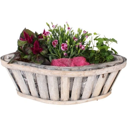 Dieses dekorative Pflanzenarrangement ist mit Federbusch-Celosie (Celosia), Nelken (Dianthus) und Efeu (Hedera) bepflanzt. Blütenfarben und Dekoration sind in hübschem Rosa und Violett gehalten.