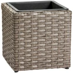 Mit dem würfelförmigen Pflanzkasten lassen sich Küchenkräuter oder Zierpflanzen dekorativ unterbringen. Er ist zur Aufstellung auf der Terrasse, auf dem Balkon oder vor der Haustür geeignet. Seine quadratische Form hat die Grundmaße 28 cm x 28 cm. Seine Höhe beträgt ebenfalls 28 cm. Gefertigt ist das Pflanzgefäß aus Polyrattan mit hellbrauner Oberfläche. Zum Einpflanzen der Blumen gibt es einen herausnehmbaren Einsatz aus Kunststoff. Um Bodenunebenheiten ausgleichen zu können, ist der Kasten mit Stellfüßen ausgestattet. Mit Witterungs- und UV-Beständigkeit kann er ganzjährig draußen verwendet werden.
