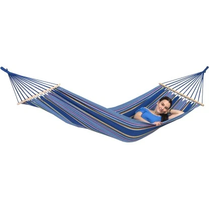 Stabhängematte Tonga Ocean ist kein Riese und dennoch bequem. Aufgrund extra langer Schnüre bzw. extra breiter Stoffbahnen haben wir es geschafft, dass selbst weniger große Hängematten wirklich bequem werden.