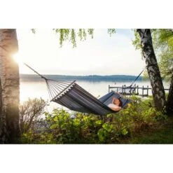 Hängematte aus wetterfestem und UV-beständigem EllTex-Material, extra haltbar und doch kuschelig weich wie Baumwolle.