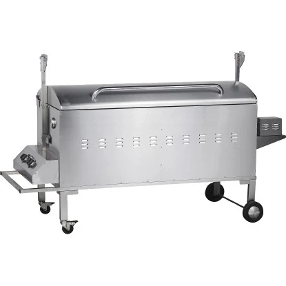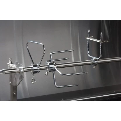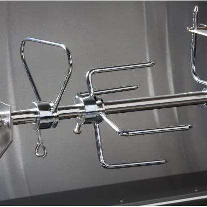 Die zwei leistungsstarken Edelstahlbrenner mit je 6,75 kW erlauben ein umfangreiches Grillvergnügen. Der kraftvolle Motor sorgt für ein gleichmäßiges Drehen, sodass die Grillspeisen perfekt von allen Seiten gegart werden. Der Deckel sorgt im geschlossenen Zustand für eine gleichmäßige Hitzeverteilung im Garraum. Sobald die Speisen fertig gegart sind, können Sie den Drehspieß in eine Tranchierposition stellen. Dadurch können Sie z.B. ein Spanferkel fachgerecht zerlegen. Die mitgelieferte Edelstahl-Fettauffangschale vereinfacht das Tranchieren und die anschließende Reinigung.