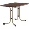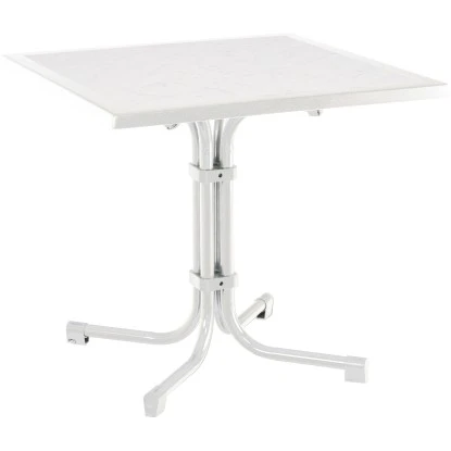 Die extrem strapazierfähige Werzalit-Tischplatte ist absolut wetterfest und pflegeleicht. Sie besitzt eine weiße Oberflächenmarmorierung und hat keine Kanten und Fugen. Die Platte ist kratzfest, hitzebeständig und belastbar. Das stabile und standfeste Stahlrohrgestell mit doppeltem Klappmechanismus und Sicherheitsbügel ist weiß pulverbeschichtet. Mit wenigen Handgriffen wird die Platte abgeklappt und das Fußgestell einfach seitlich eingeschwenkt. Dank der Niveauausgleichsschraube kann die optimale Standfestigkeit auf unebenem Boden eingestellt werden.