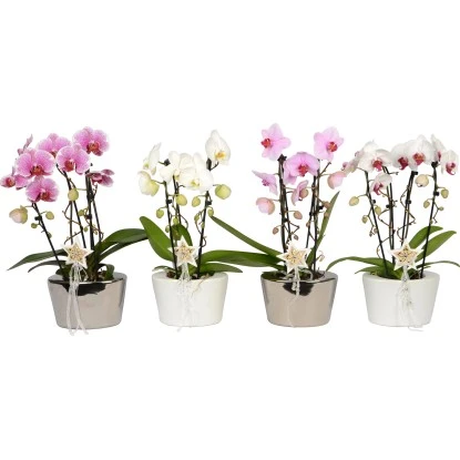Dieses weihnachtliche Arrangement mit einer zweitriebigen Schmetterlingsorchidee in Kaskadenform ist in den Keramikfarben Weiß und Silber erhältlich. Weihnachtlich dekoriert veredeln diese Kompositionen jede Wohnung, da sie zu allen Einrichtungsstilen passen.